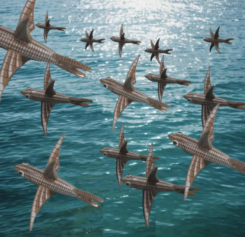 魚の群れが海面から飛び上がり、