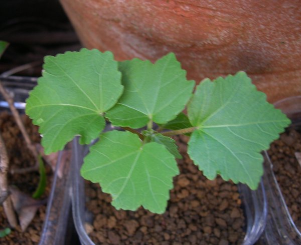 為丸式で挿し木した「スイフヨウ」です。生意気に四枚の葉。