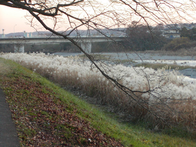 川筋にそった遊歩道を下流にくだる。ありふれているかもしれないけれど、ススキがみごとだ。