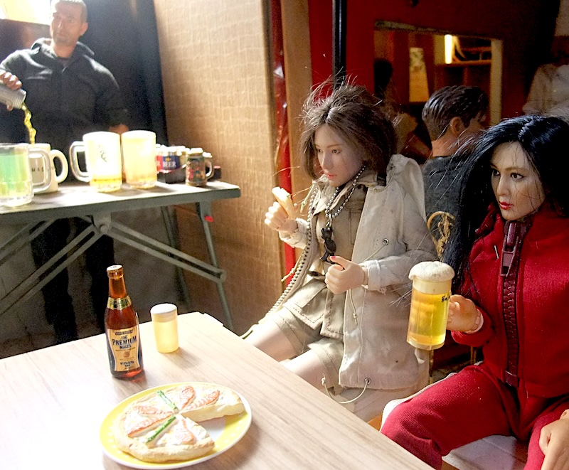 ビール片手にピザを物色している。