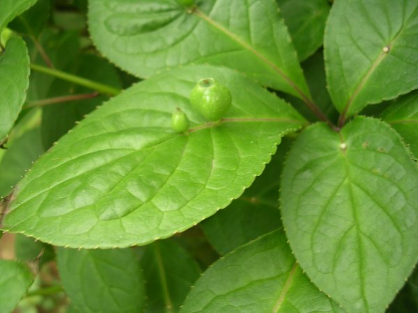 ミズキの仲間なんだ。そういえば似ている。いつも写させていただくお宅で、今年は兄弟のいる葉を。普通は実はひとつです。